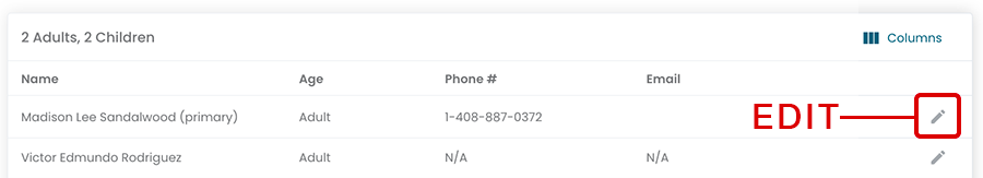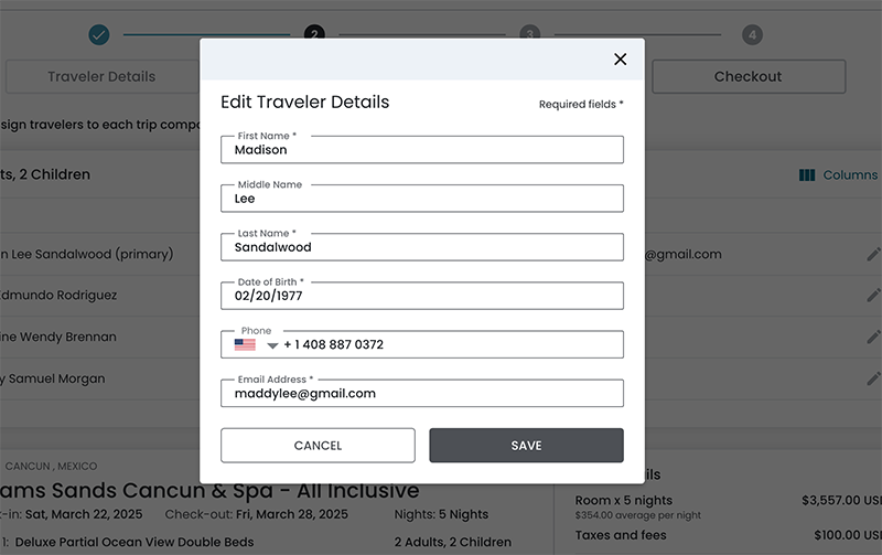 The user can edit the details of the traveler when the edit button is clicked which prompts a modal to appear with input fields.