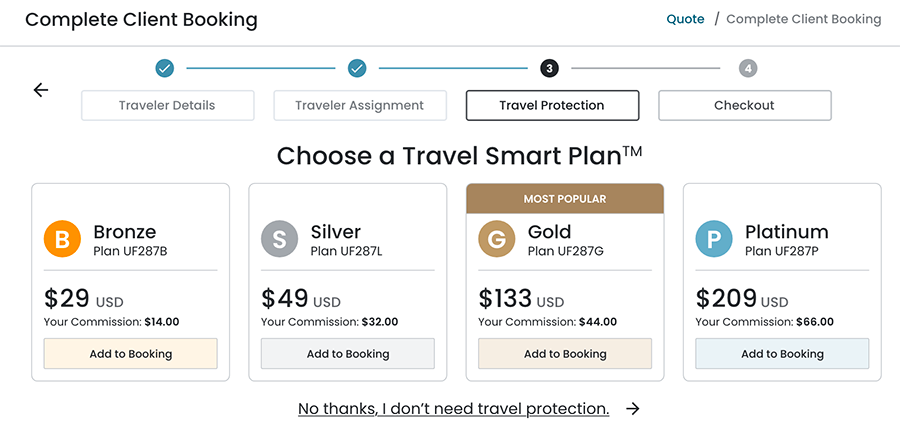 This step introduces the available options (Silver, Gold, Platinum), explaining their key features. User will click on the 'Add to Booking' button next to the plan that they prefer to include in the booking.