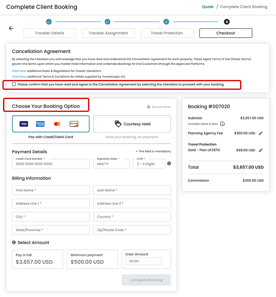 The final step in the Bx Booking Path, where travel advisors complete their booking by securely entering their payment details and billing info or users can reserve their booking without immediate payment.