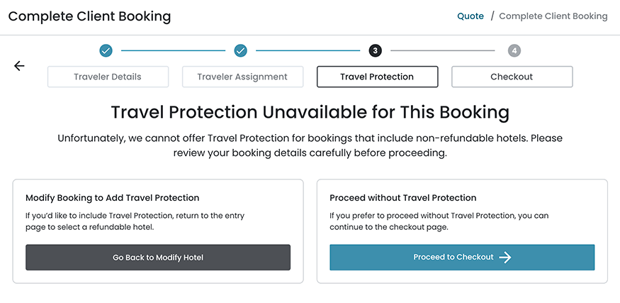 The page will tell user that travel protection is unavailable. Also, the step will provide two options whether to proceed or return to the entry page.