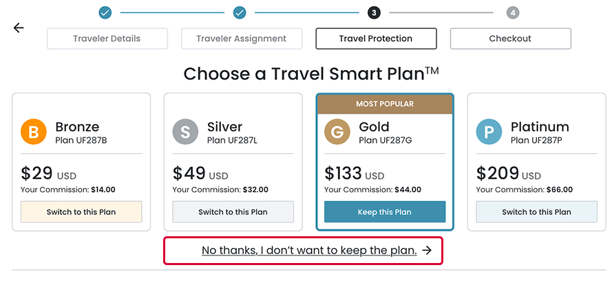 If the user no longer wants a plan, they can click on the link that says, "No thanks, I don't want to keep this plan." This will remove their selection, and the plan will no longer appear when they proceed to the Checkout page.