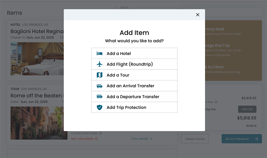 The Quote Builder page provides users with a starting point to build or customize a travel quote. The 'Add Item' button acts as the gateway to initiate the flight addition process.