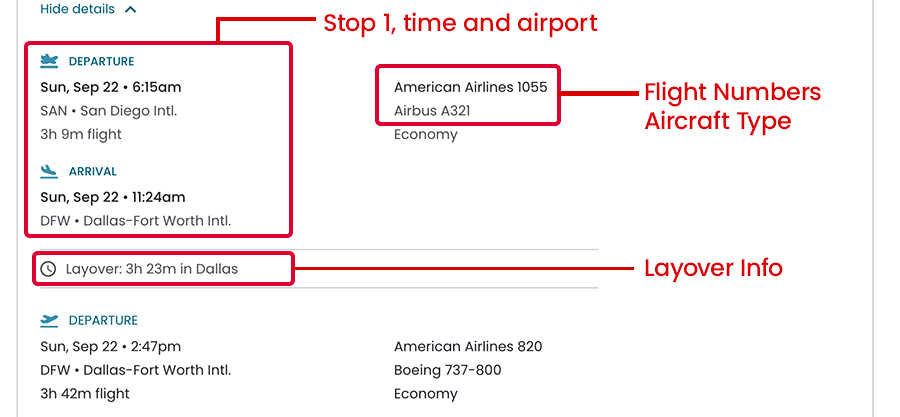 Display the departure and arrival times for each leg of the journey, including intermediate stops, with corresponding airport codes. For multi-stop flights, include the layover duration clearly beneath the relevant segment. Additionally, show the flight number and aircraft type for each segment.