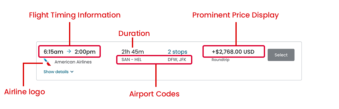 Display all necessary details like flight timing, departure and arrival airport codes, duration, and airlines. The price should be the most visible element on a flight listing to allow users to quickly compare options.