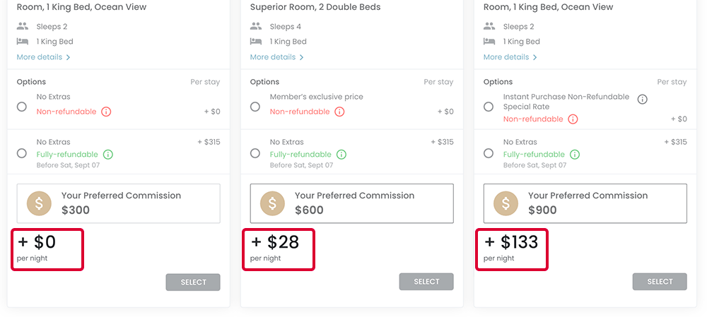 The single "Select" button eliminates ambiguity by providing one clear action for the user to take when choosing a room. This sets the expectation that additional steps, such as adding a flight, will follow.