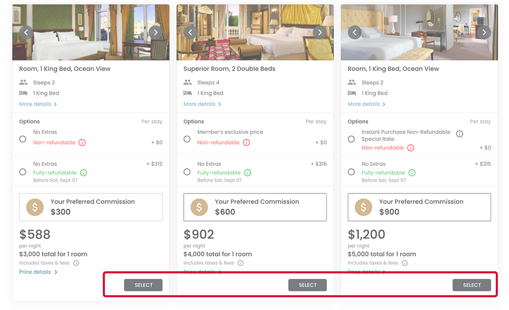 The buttons on the Room cards need to reflect the integrated nature of the flow. By replacing "Book Now" and "Save to Quote" with a single "Select" button, the user is provided with a clear and unified action that simplifies the process.