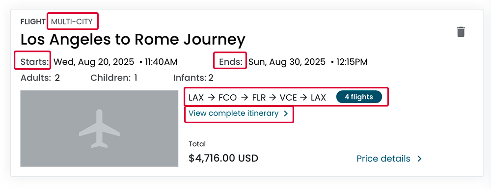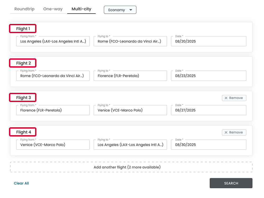 Book flights across multiple destinations in a single transaction.