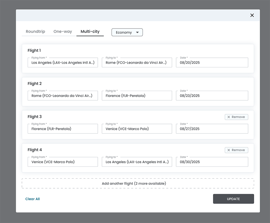 - When "Multi‐city" is selected, dynamically show the leg structure