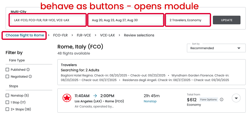 Instead of overwhelming the travel advisors with the full 4‐leg search interface on the flight results pages, they will get a streamlined panel.