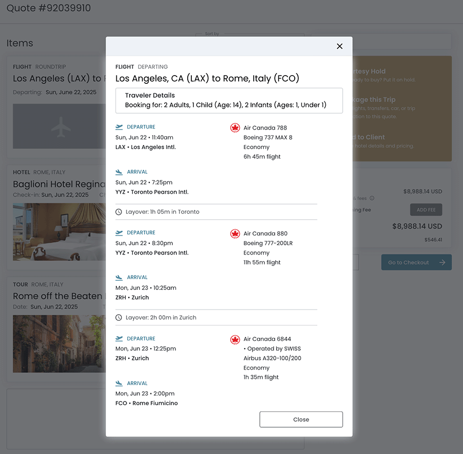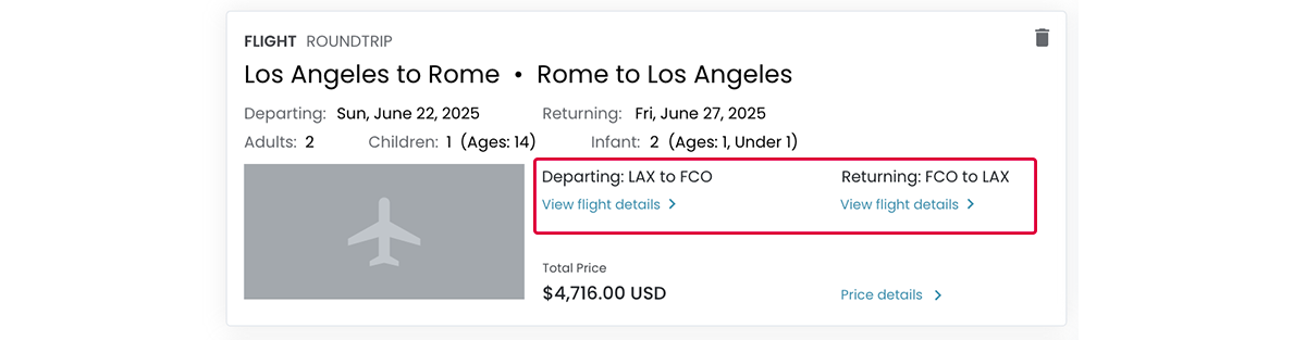 Layout of card containing an over of the roundtip flight with buttons to see additional details of the departing and returning flights.