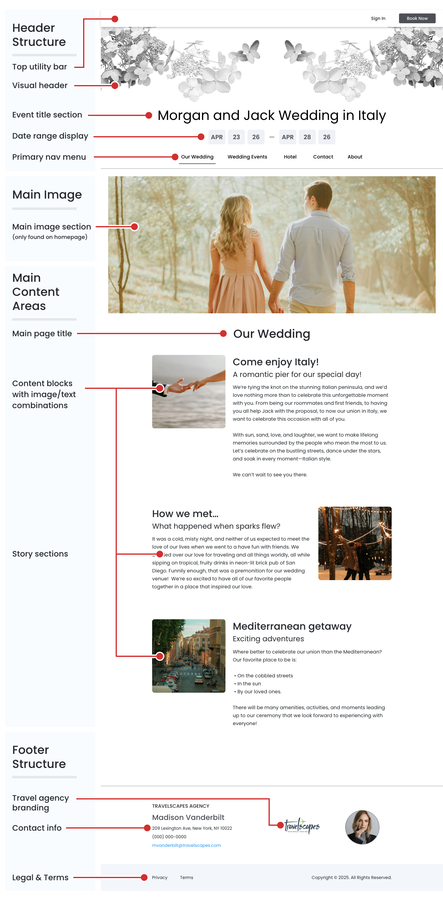 Each structural element serves a specific function in the user journey while maintaining visual consistency and brand presence. This modular framework is designed to accommodate all three event themes (wedding, vacation, and corporate) through consistent structural patterns while allowing for theme-specific visual customization.