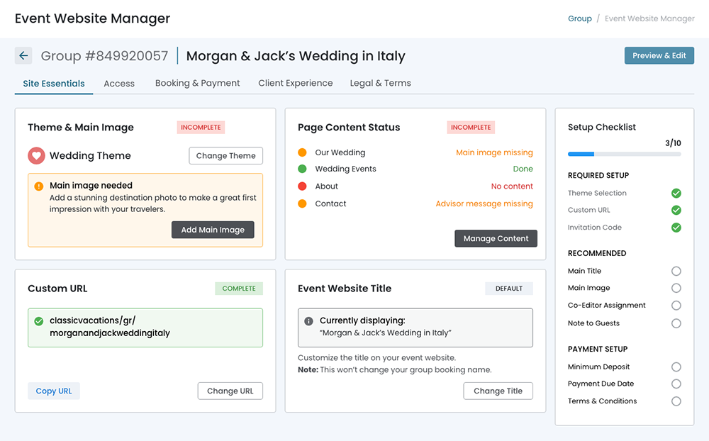 The Event Website Manager uses a structured dashboard layout that prioritizes progressive task completion while maintaining constant access to key actions and context. This architecture balances three essential elements: contextual navigation, actionable content, and progress tracking.