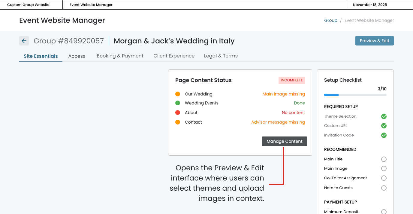 The "Manage Content" button opens the Preview & Edit interface where advisors can address flagged issues across all pages in one focused session, streamlining the content creation workflow.