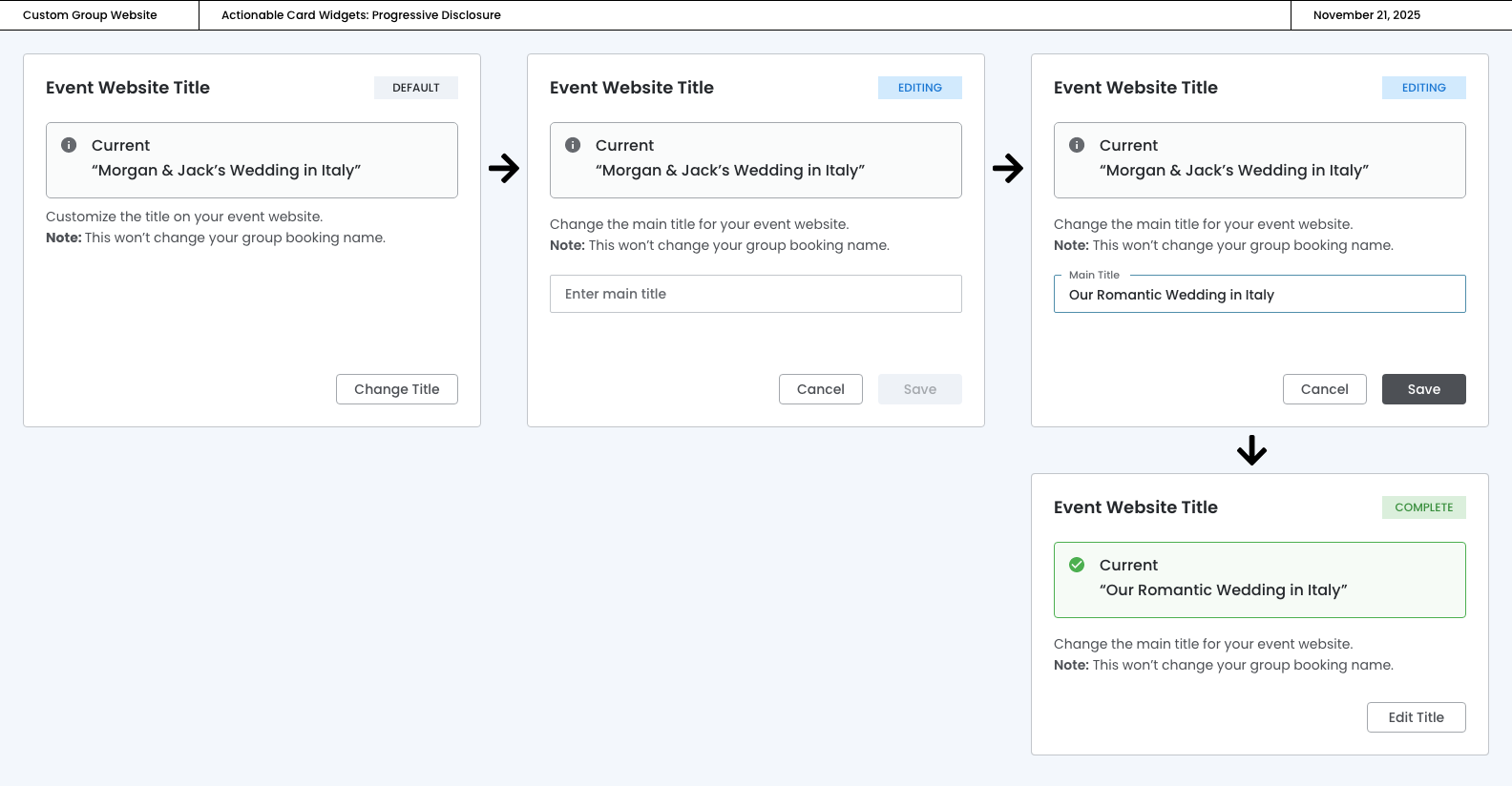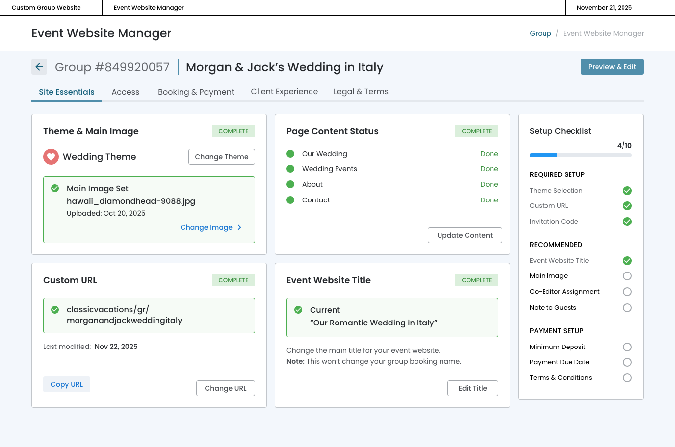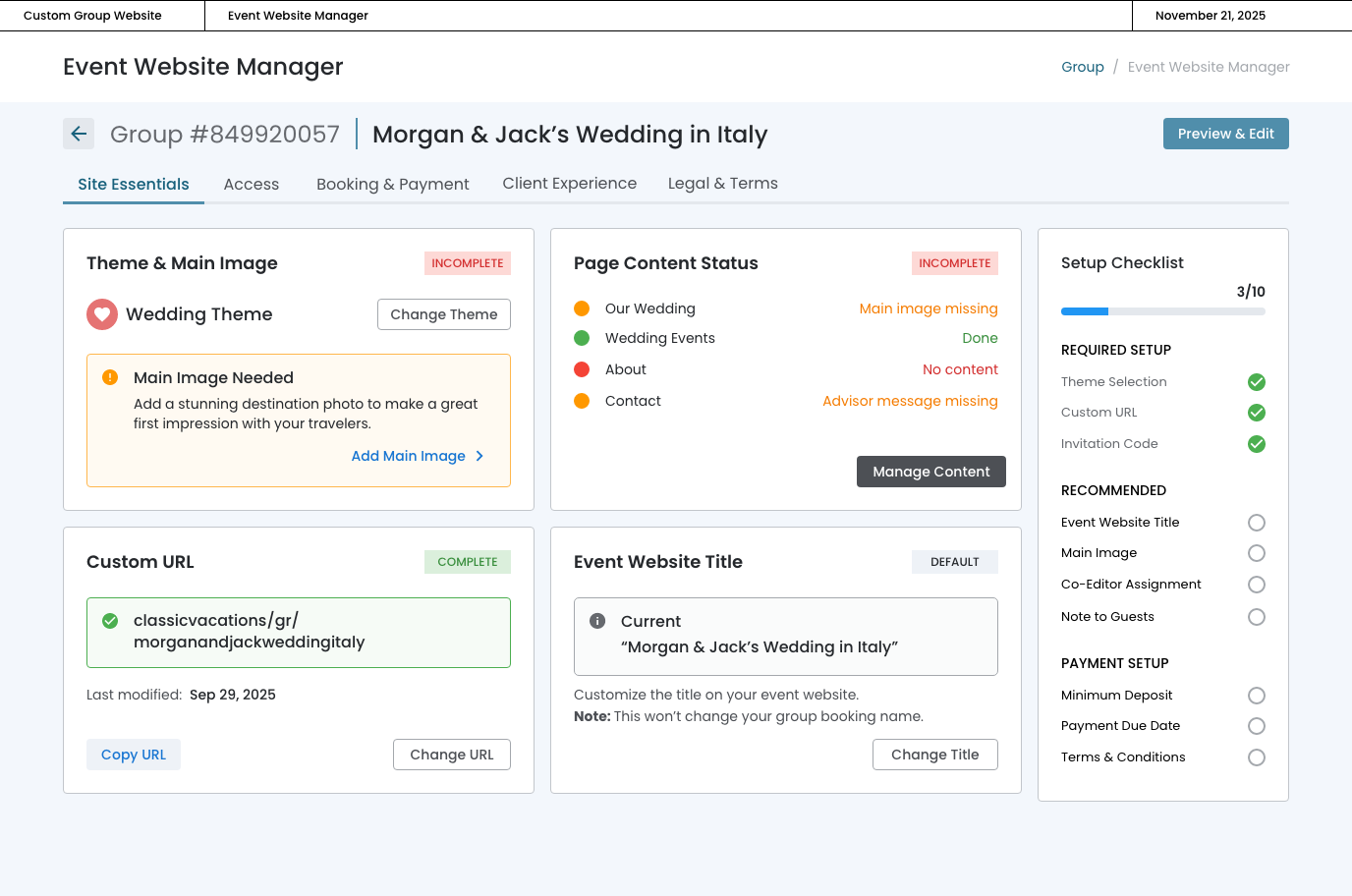 The event website will inherit the name of the group, but the advisor can change the main title from this card.