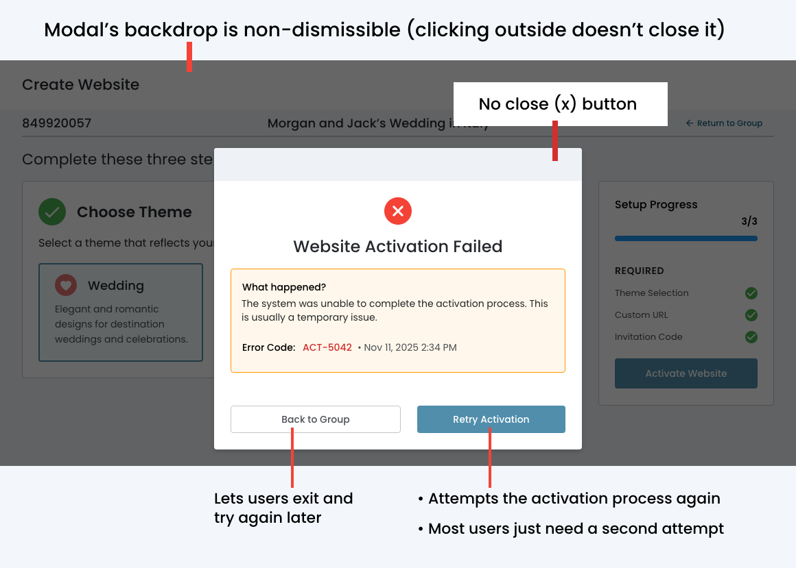 - Helpful Context ‐ Brief explanation like "We encountered an issue while creating your website".