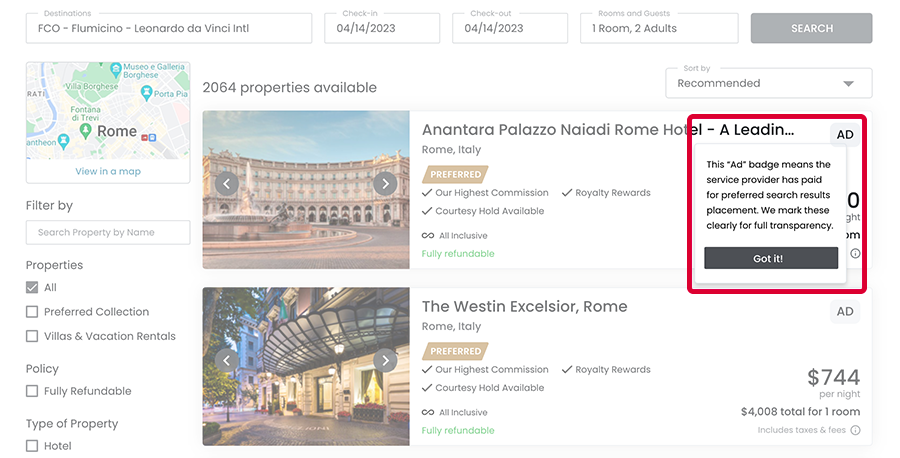 Our hotel partners will have their product featured more prominently ‐ often appearing higher up in the search results, with the following details: