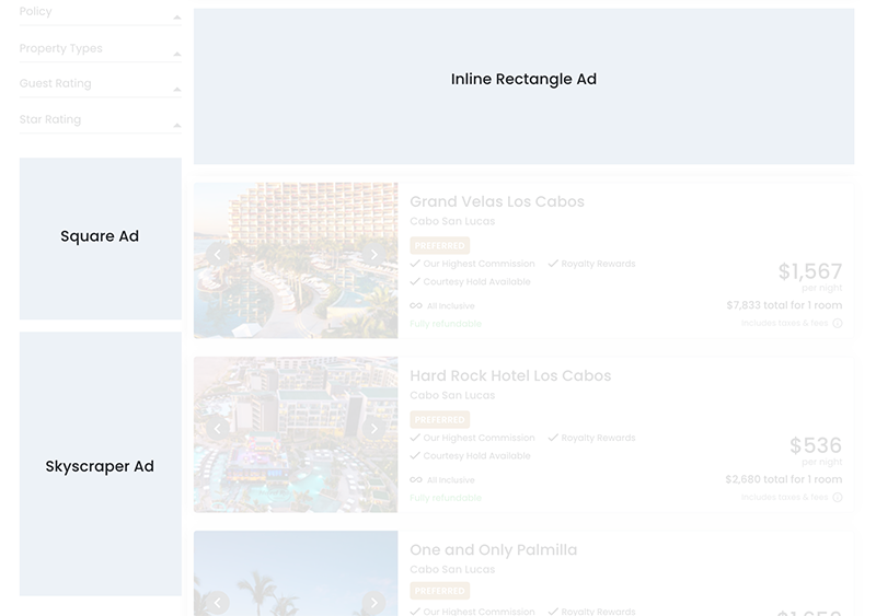 The search results page in the booking flow will feature a range of banner sizes, including: