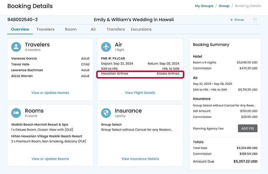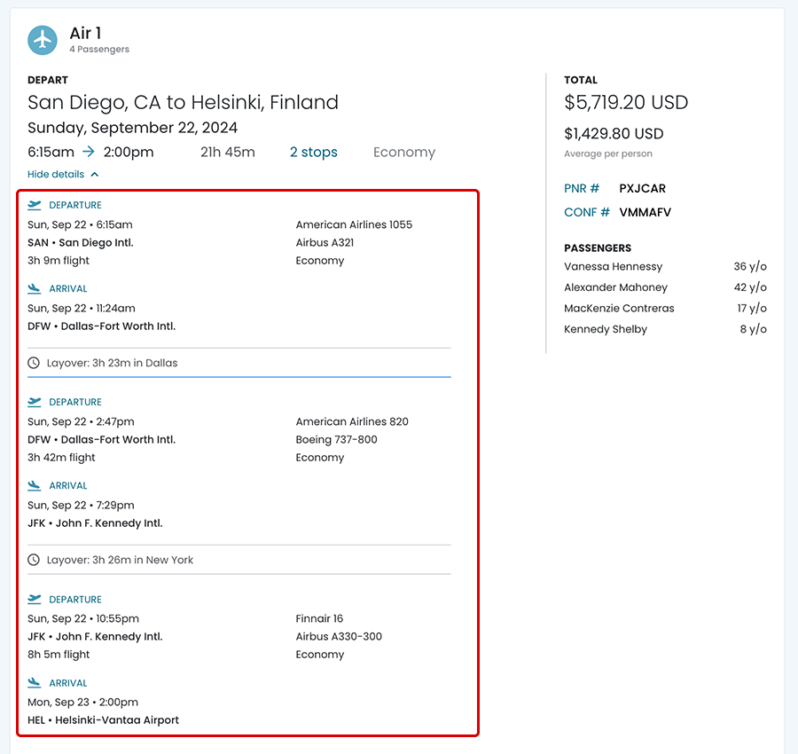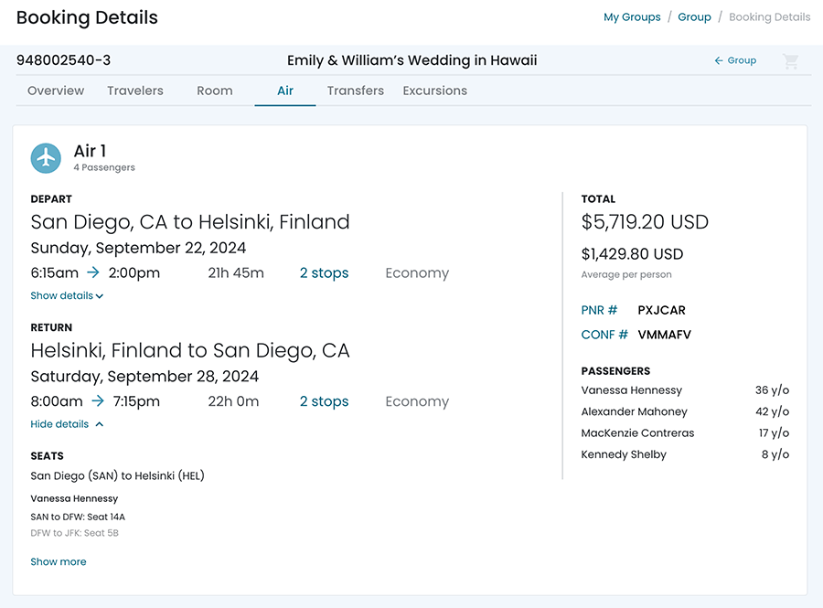 When the user clicks on the View Details link from the Overview screen, they will see the booked flight data in a single card.