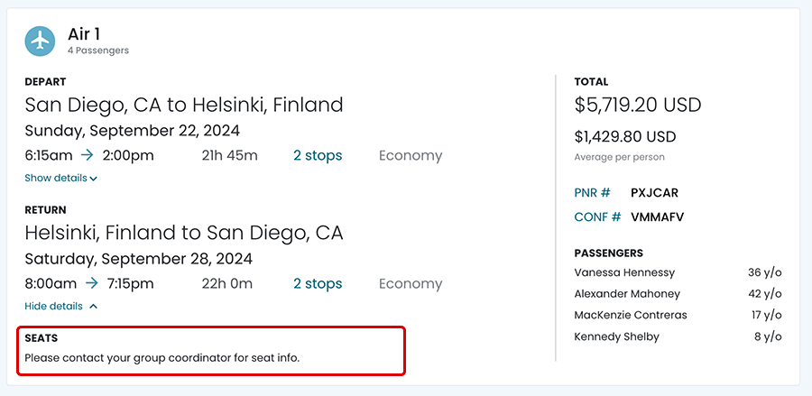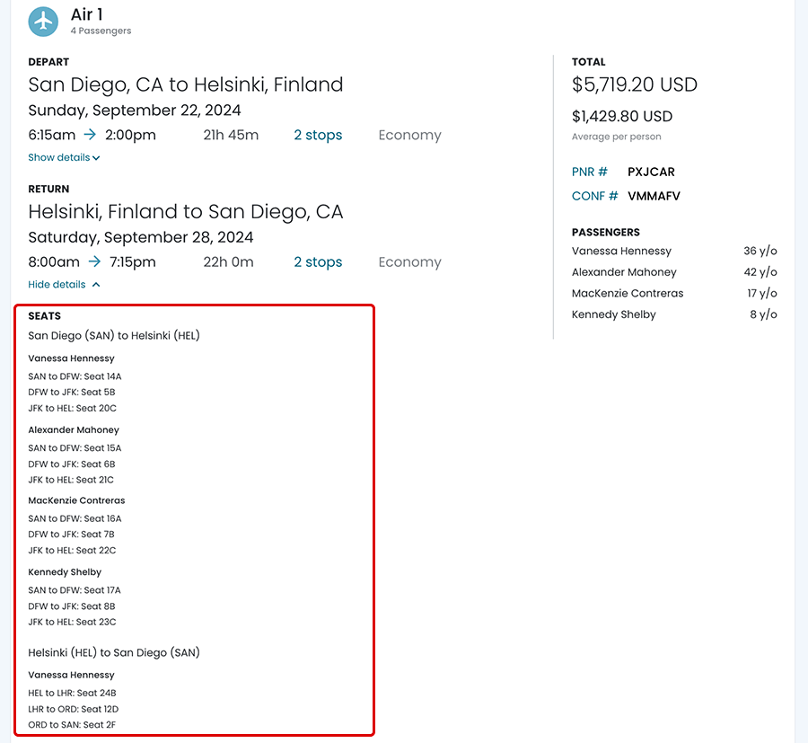 In the seat section of the booked flight, the user will see columns of the passenger names and the assigned seats.