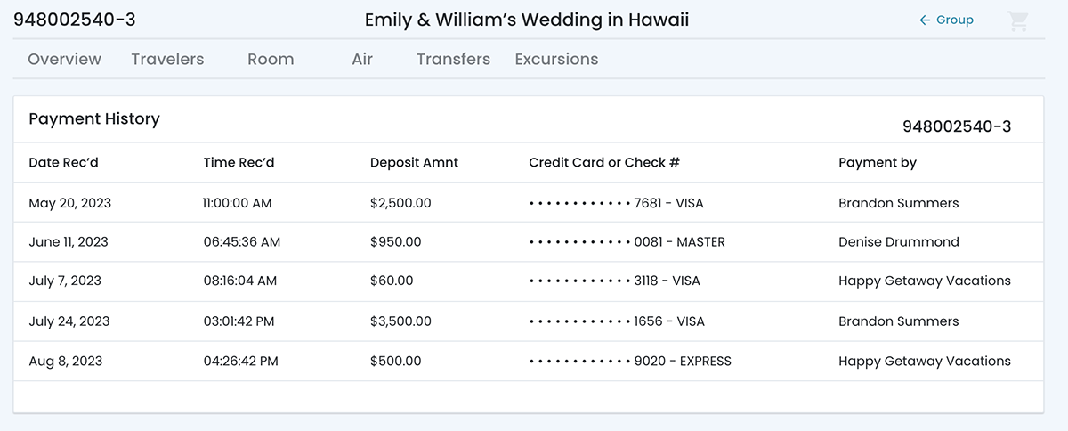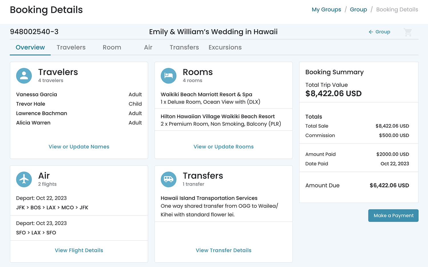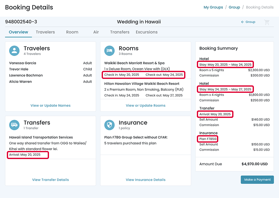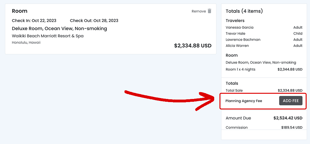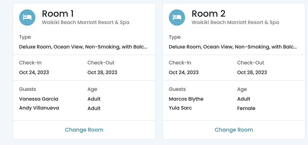 If there are multiple rooms, user will see a card for each room. The card will display the travelers in each room.