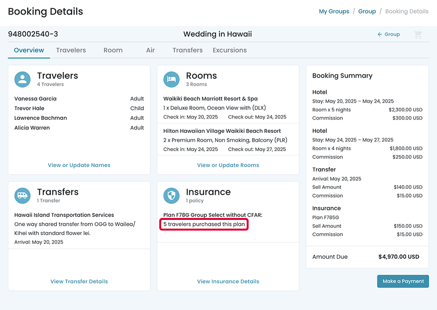 Stakeholders requested adding the number of travelers that have purchased a plan. In the card, under the name of the travel protection plan, the number of travelers will display.
