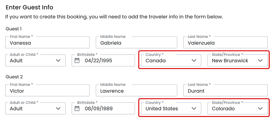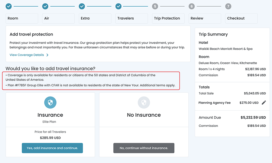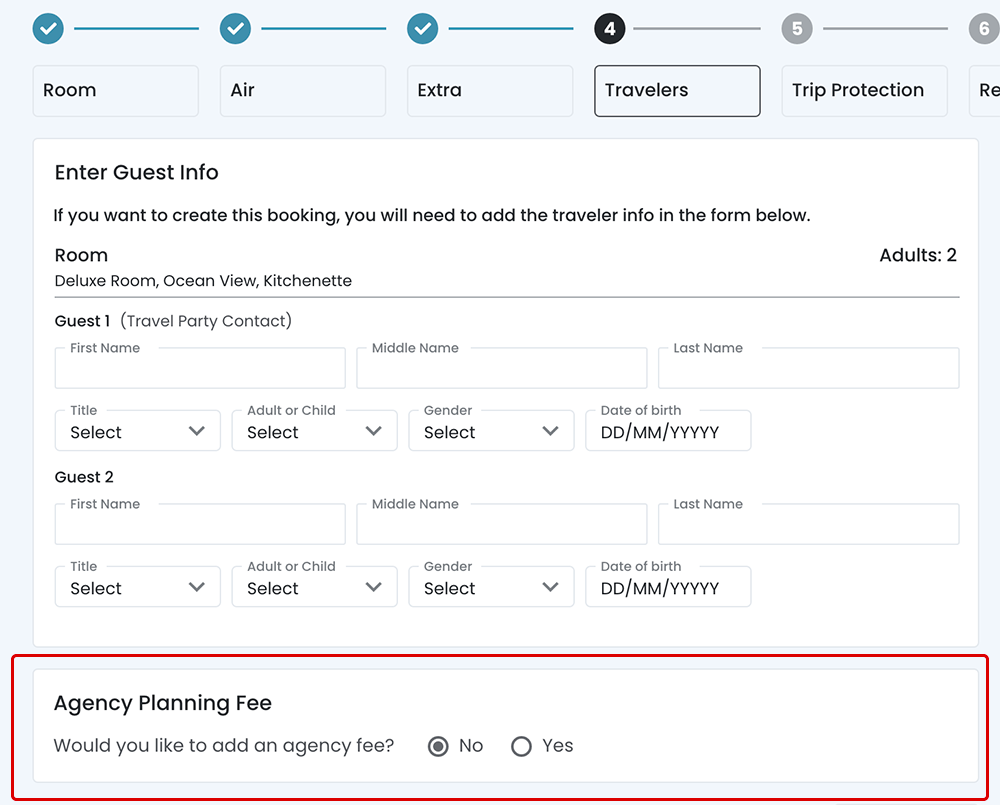 User needs to enter ALL of the guest info in order to enable the 'Continue' button. The Agency Planning Fee card (defaulted to No) will follow the traveler card.