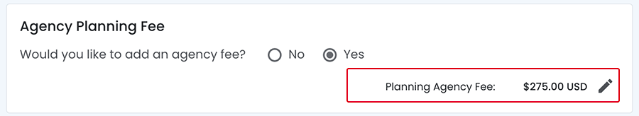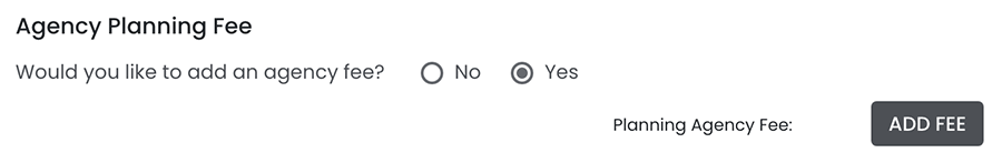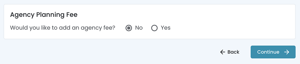 User selects 'Yes' and a button will appear to ADD FEE. The 'Continue' button will be disabled as the user needs to enter an Agency Fee in order to continue.