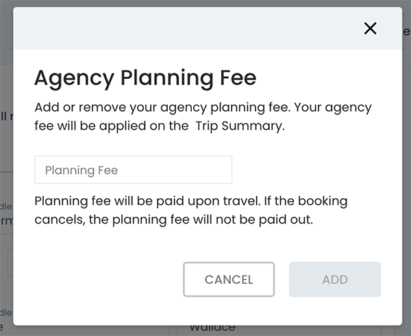 User clicks on the ADD FEE button and a pop up appears. The user can enter the desired fee.