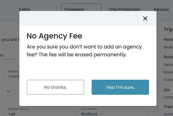 If the user selects the No button, AFTER THEY ADDED A FEE. Then a popup will appear prompting an action.