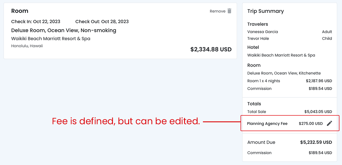 The fee will display on the card; however the user can edit the fee by clicking on the 'Edit' icon.