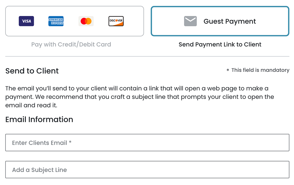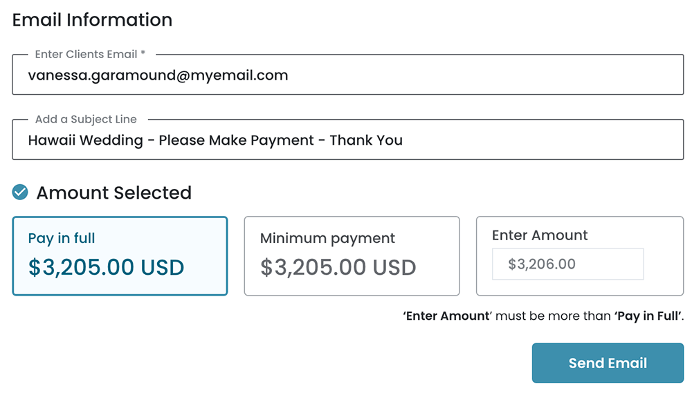 After the user enters the clients email info, they can send an email with a link. The Send Email button is enabled when: