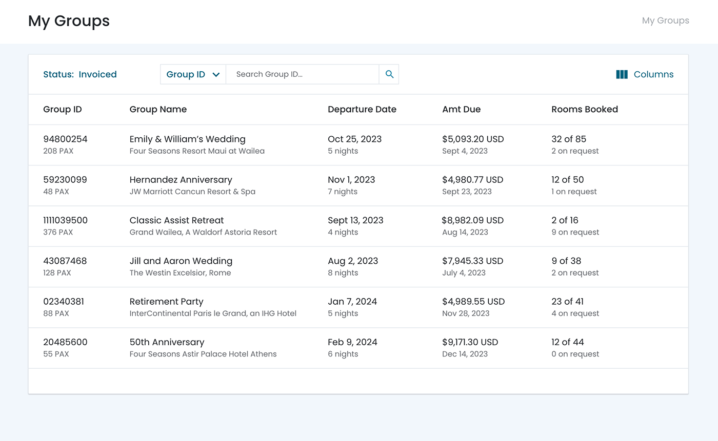 This new design replaces the current Group Overview page. Incorporate the React data grid that we presently use for the 'Bookings' page.