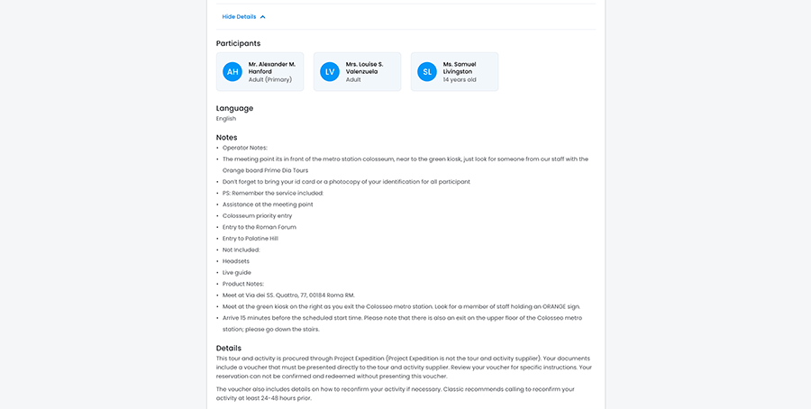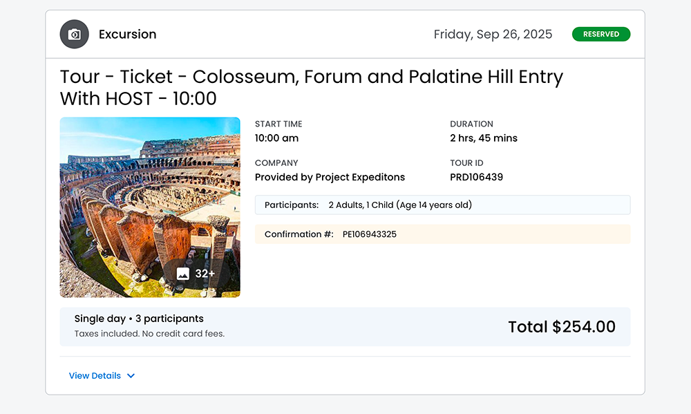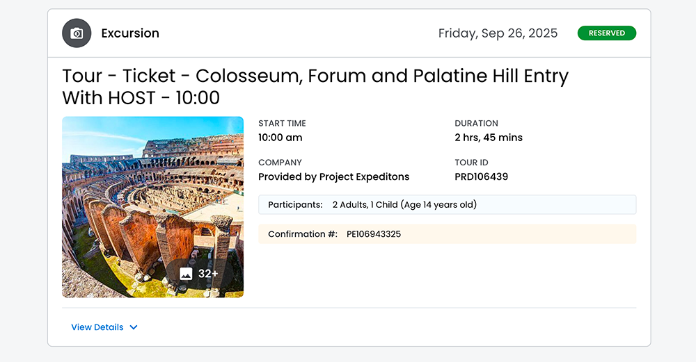 When users click the View Details expandable button on the Excursion card, the expandable section reveals:
