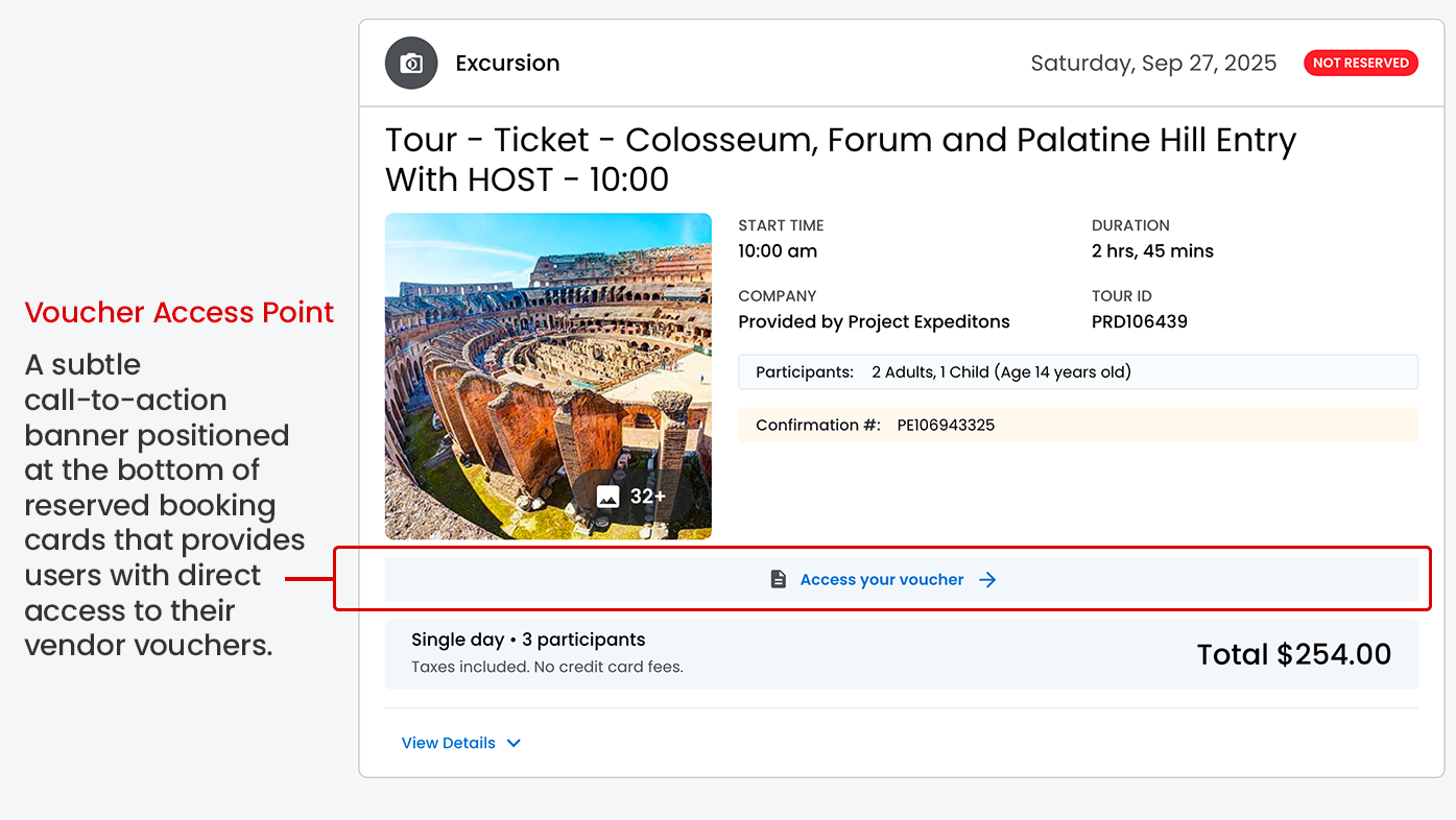 An Excursion card in an online travel itinerary serves several important functions that enhance the travel planning and experience. It provides a clear, scannable way to display activity details like time, duration, location, and key highlights without cluttering the itinerary interface.