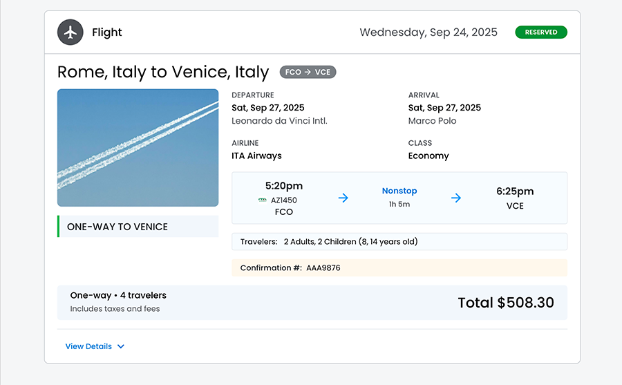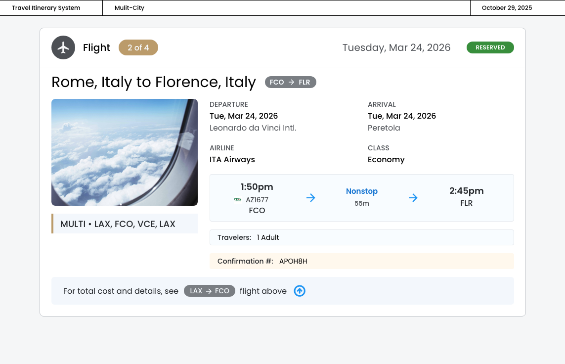 - Trip Tag ‐ A distinctive green sidebar with "ONE‐WAY TO ROME" labeling for quick identification