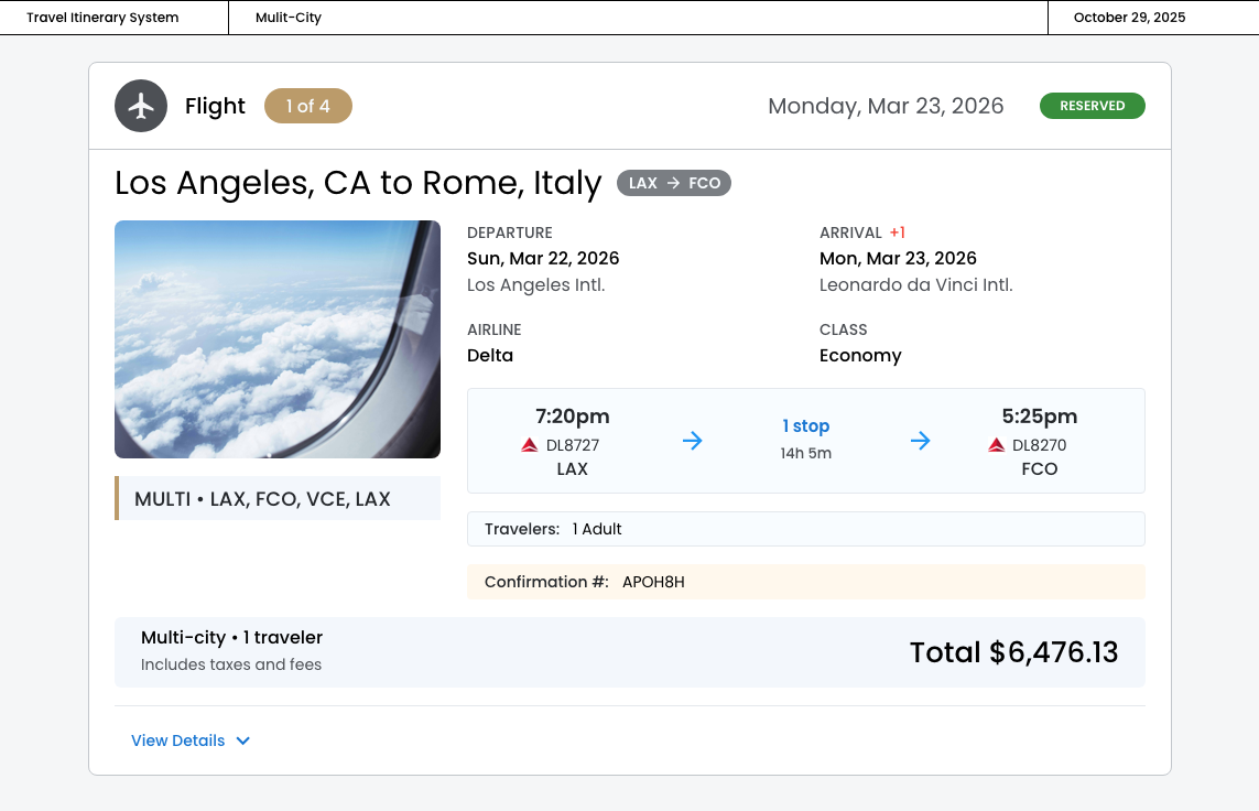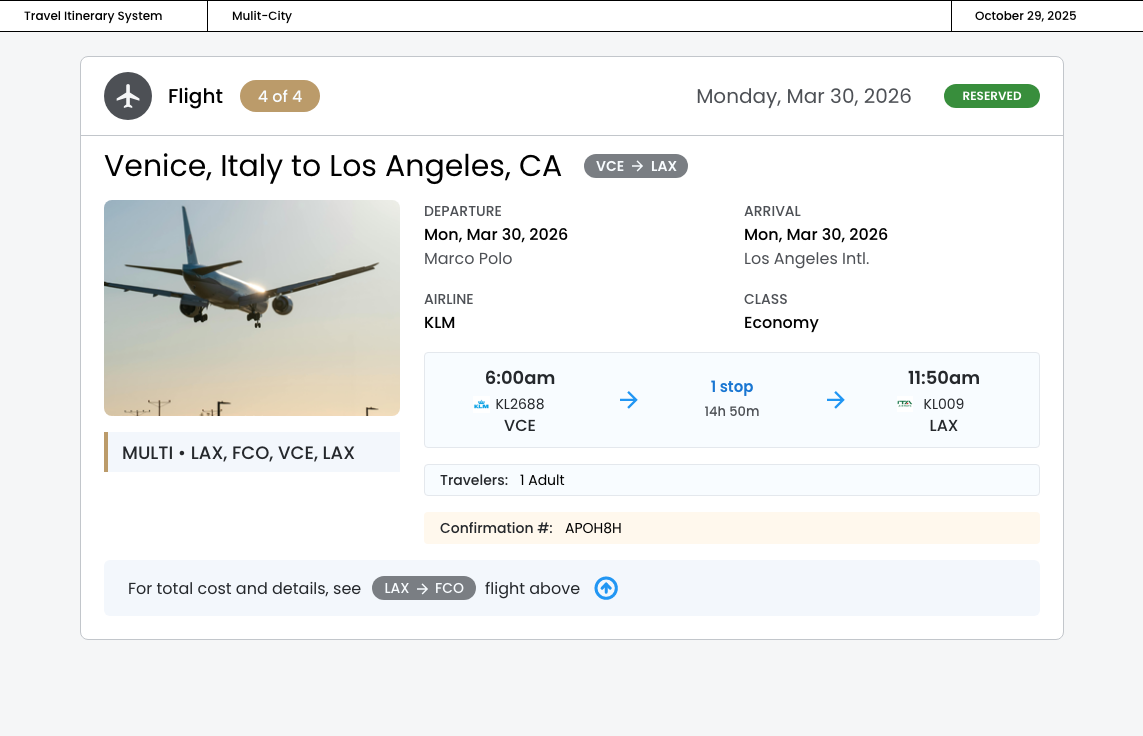 The "MULTI • LAX, FCO, VCE, LAX" indicator provides a quick overview of all destinations that creates a clear semantic relationship between separated cards, ensuring users understand these flights are part of a multi‐city booking.