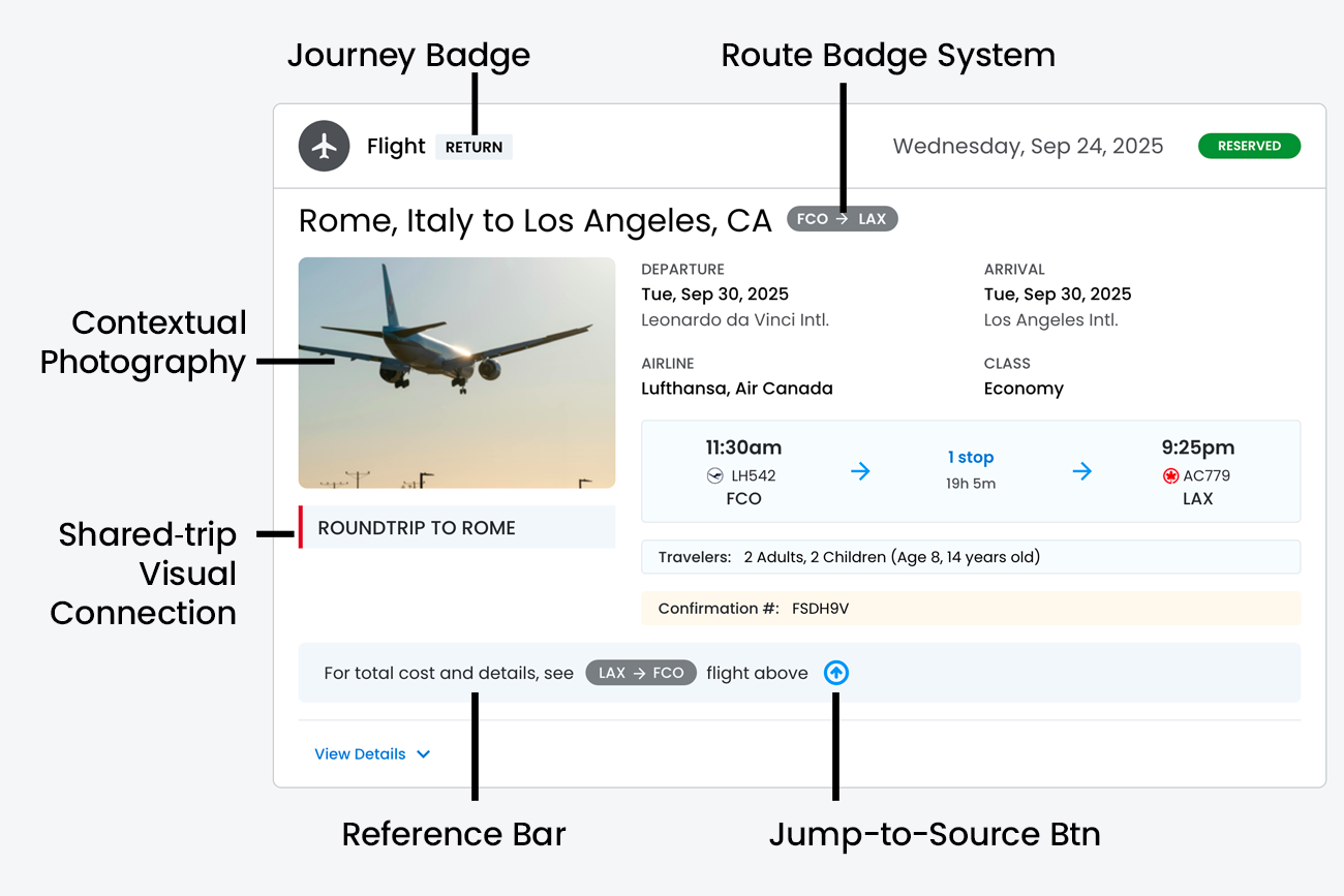 - Information Architecture ‐ Each card maintains complete flight details (times, airports, connections, traveler information) to function independently, while strategic visual cues preserve the logical relationship between segments.