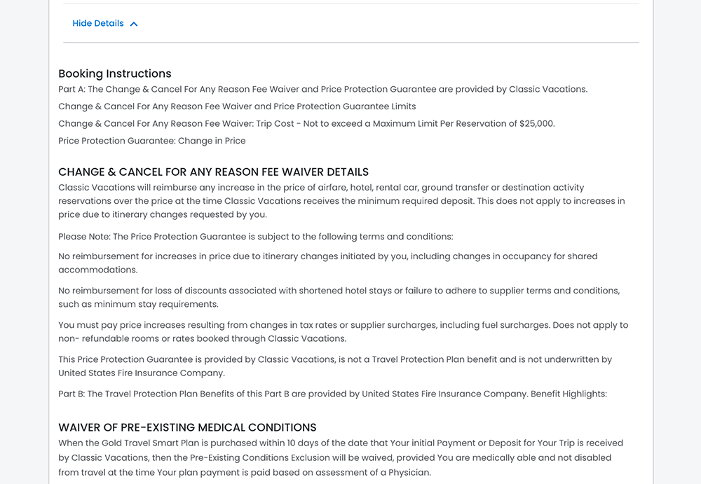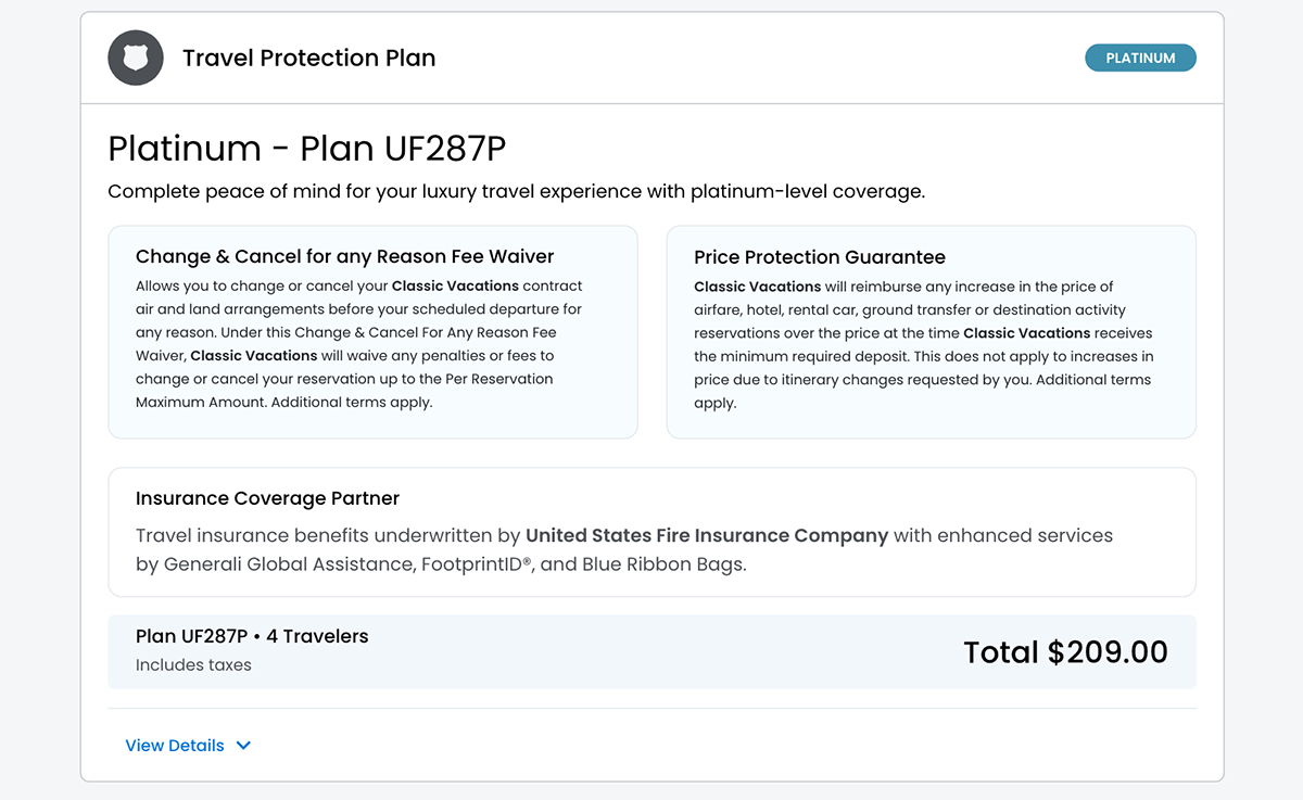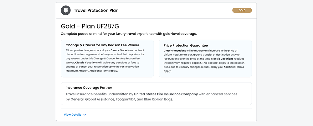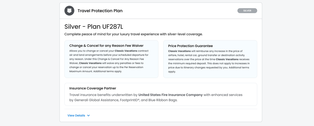 The visual hierarchy within the card guides users through Classic Vacations core benefits to the insurance coverage details.