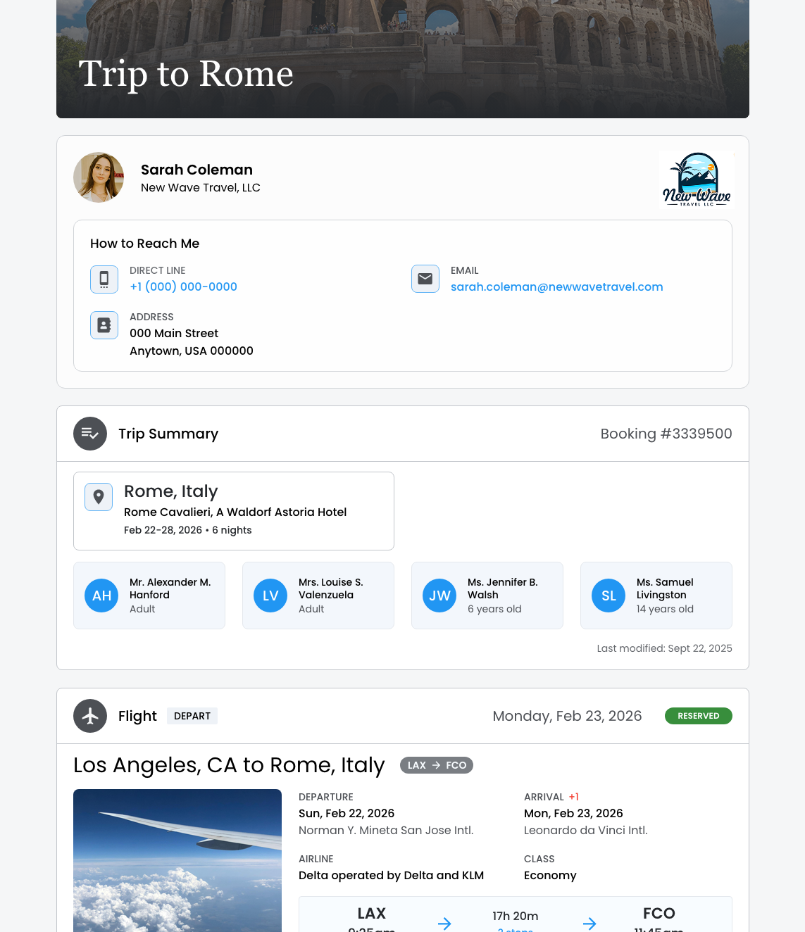 The comprehensive itinerary format that travel agents send to travelers, containing all trip details, components, and interactive elements. Includes the trip header section with an elegant background image, advisor contact card, detailed trip components (hotels, flights, transfers, etc.), and persistent navigation with critical travel information. Optimized for mobile viewing as travelers' primary reference document throughout their journey.