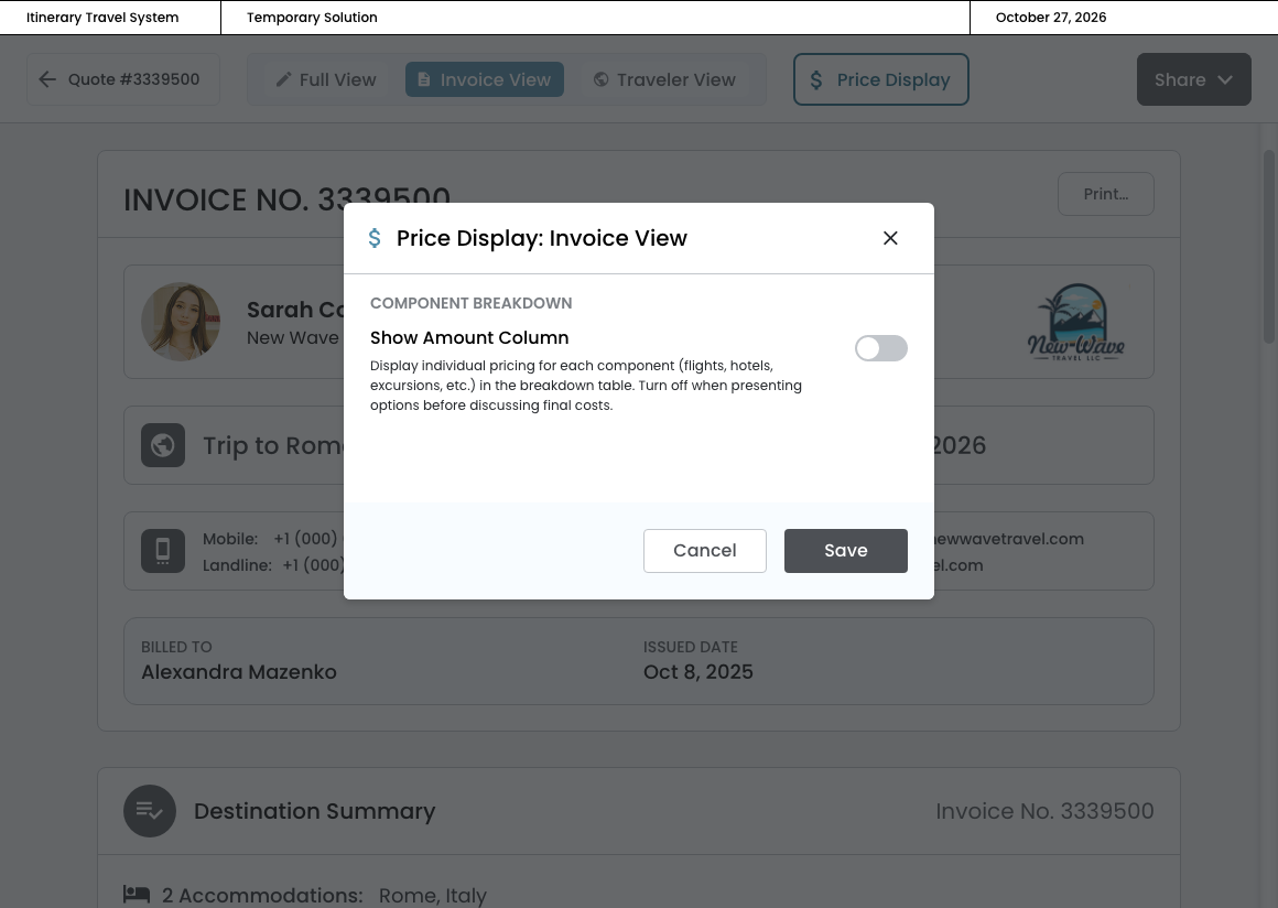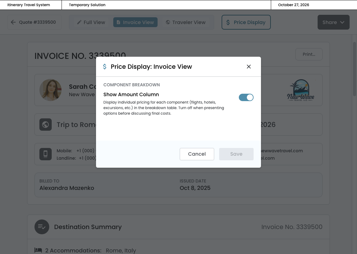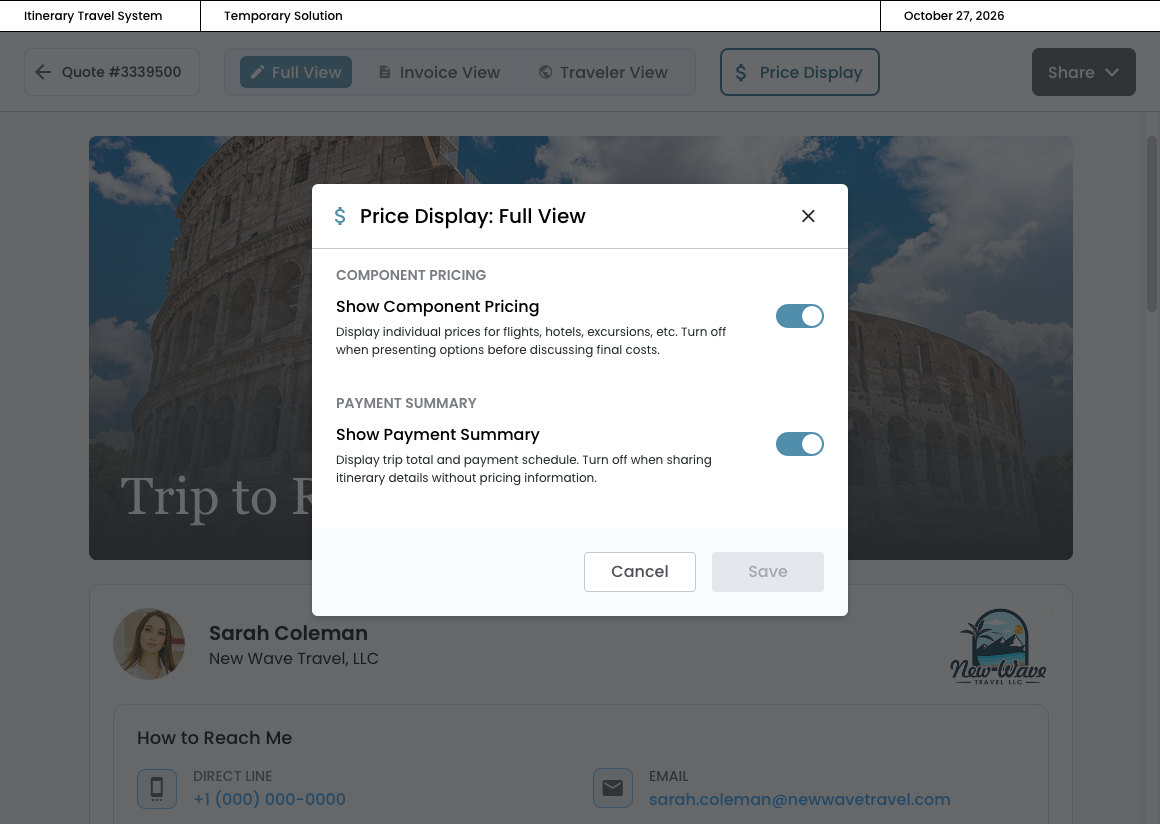 - Advisor toggles the "Show Component Pricing" setting to "OFF"