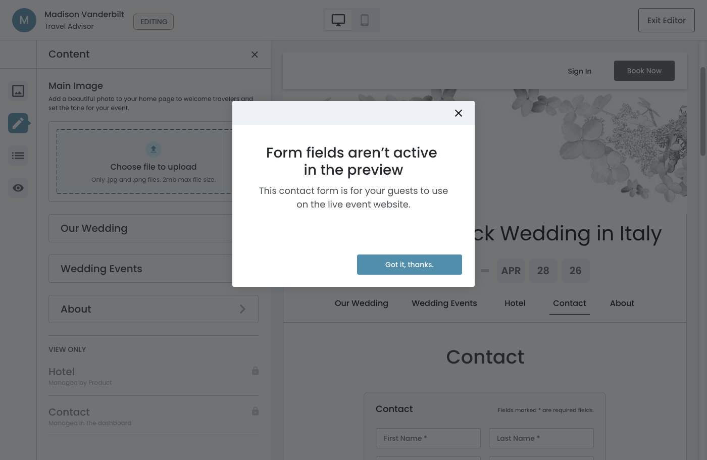 - If a user clicks on form fields in the Contact page preview, a modal appears explaining that the form is not interactive in the editor