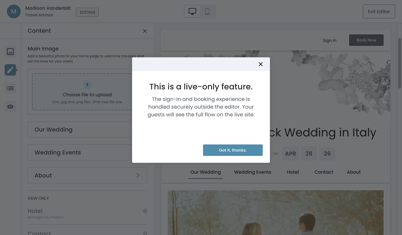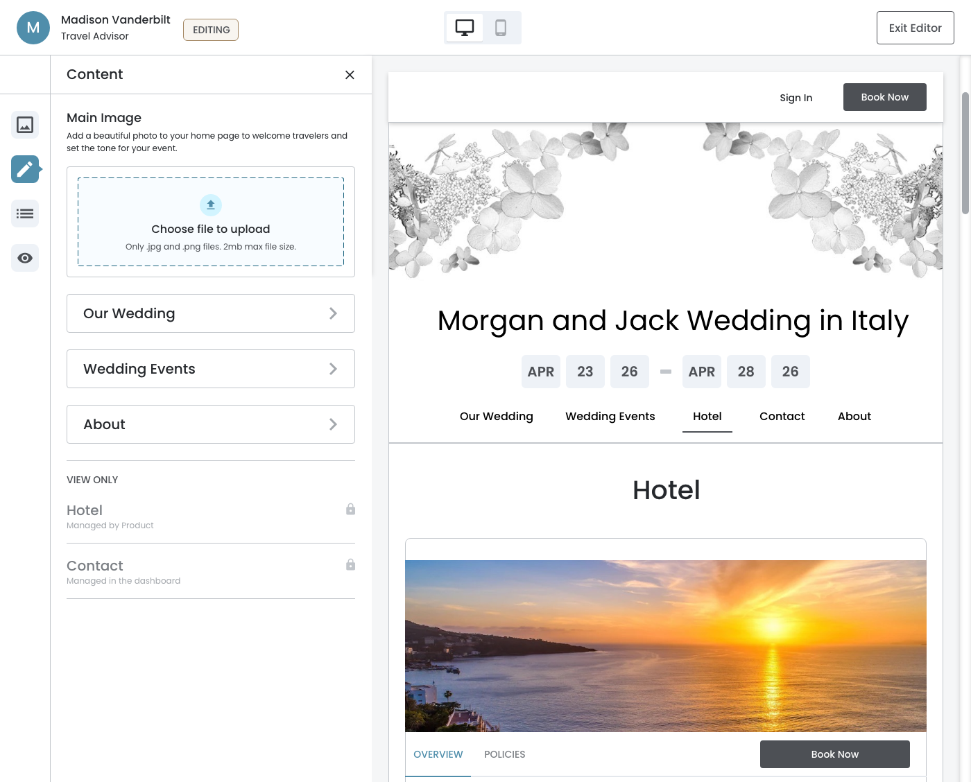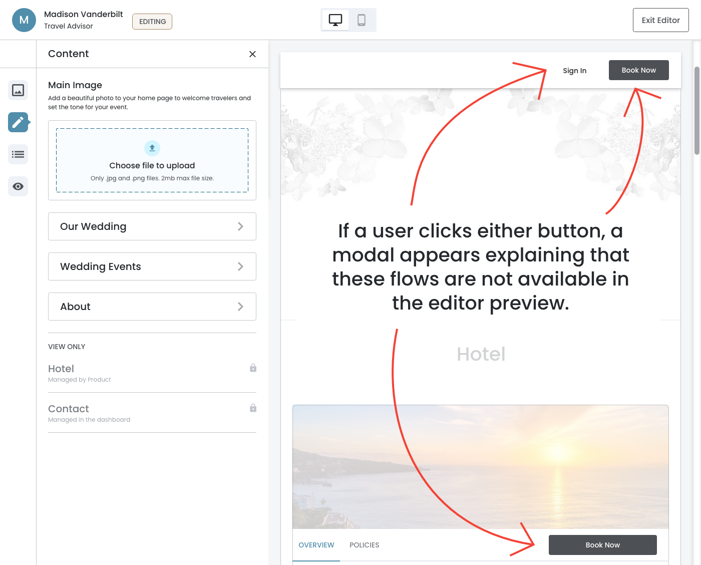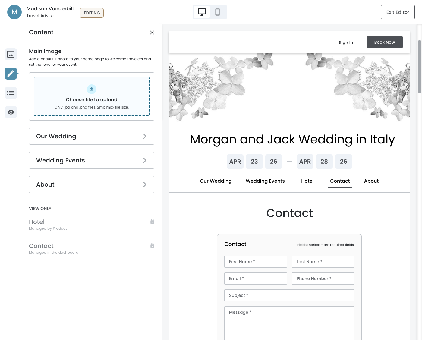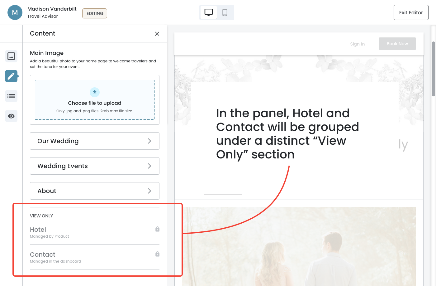 These two pages exist on the live guest‐facing site but are managed outside the editor entirely ‐ Hotel by the product team, and Contact by the travel advisor through the dashboard. This revised design defines how to handle it clearly for both user types accessing the editor.