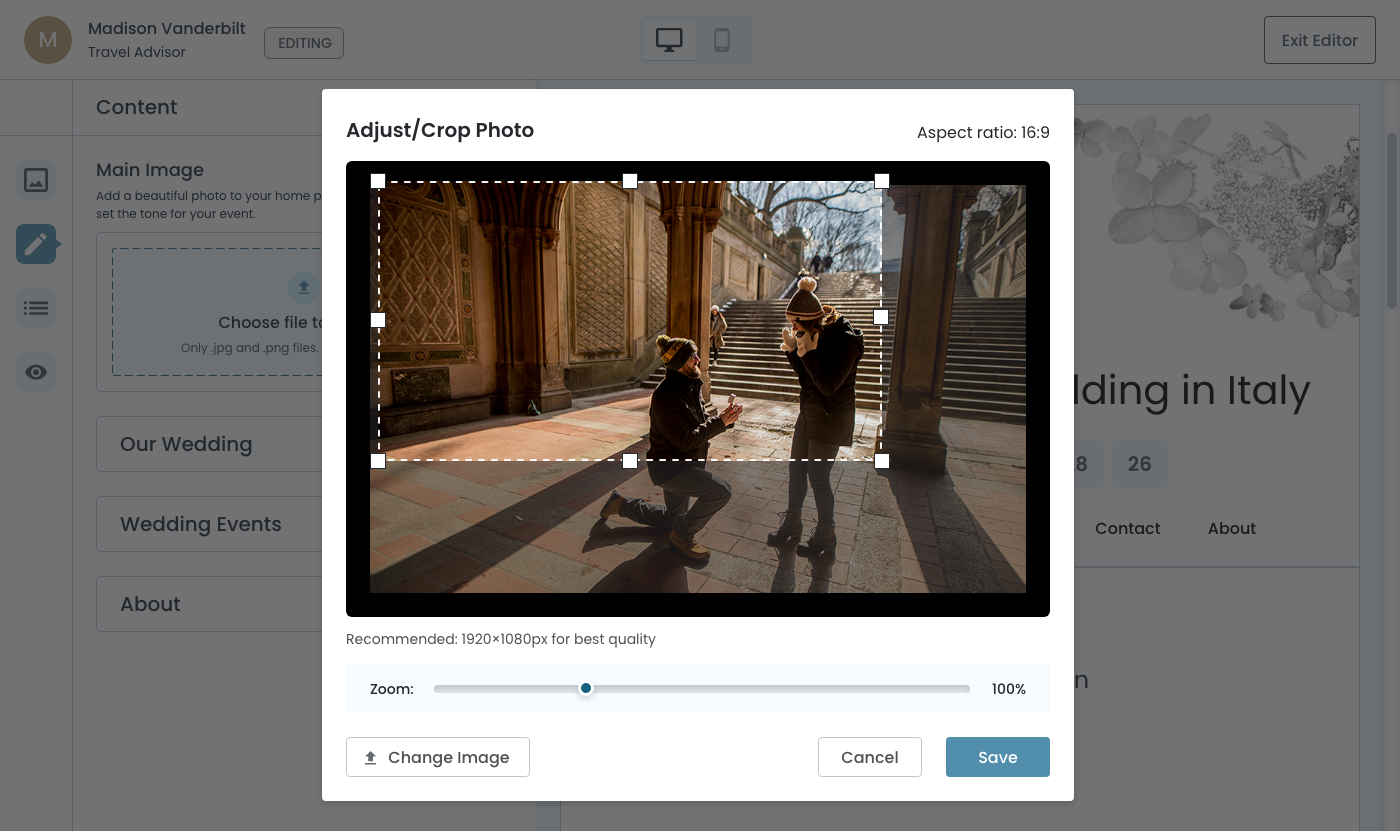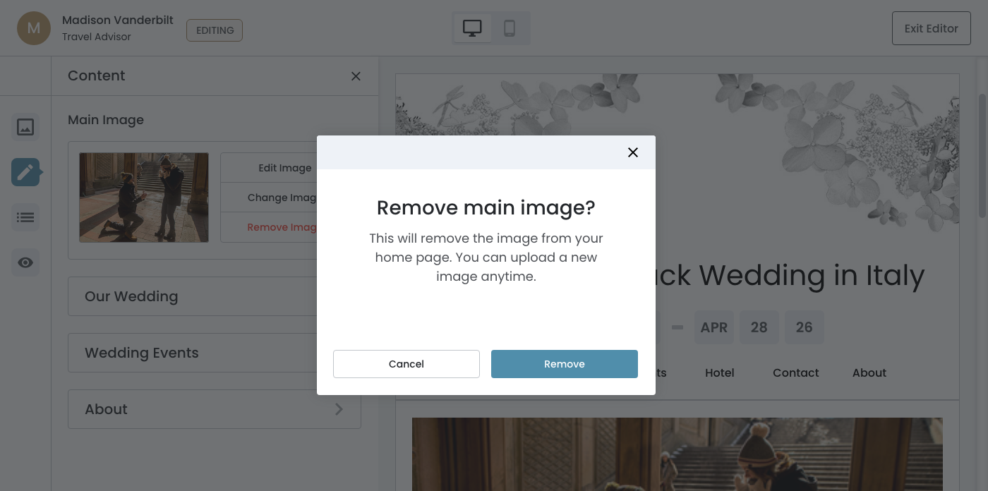 From here, users can upload the main image that spans the home page. The panel also provides quick access to content sections allowing advisors to build out their site efficiently. Each section can be customized with content, images, and details that brings group travel to life.