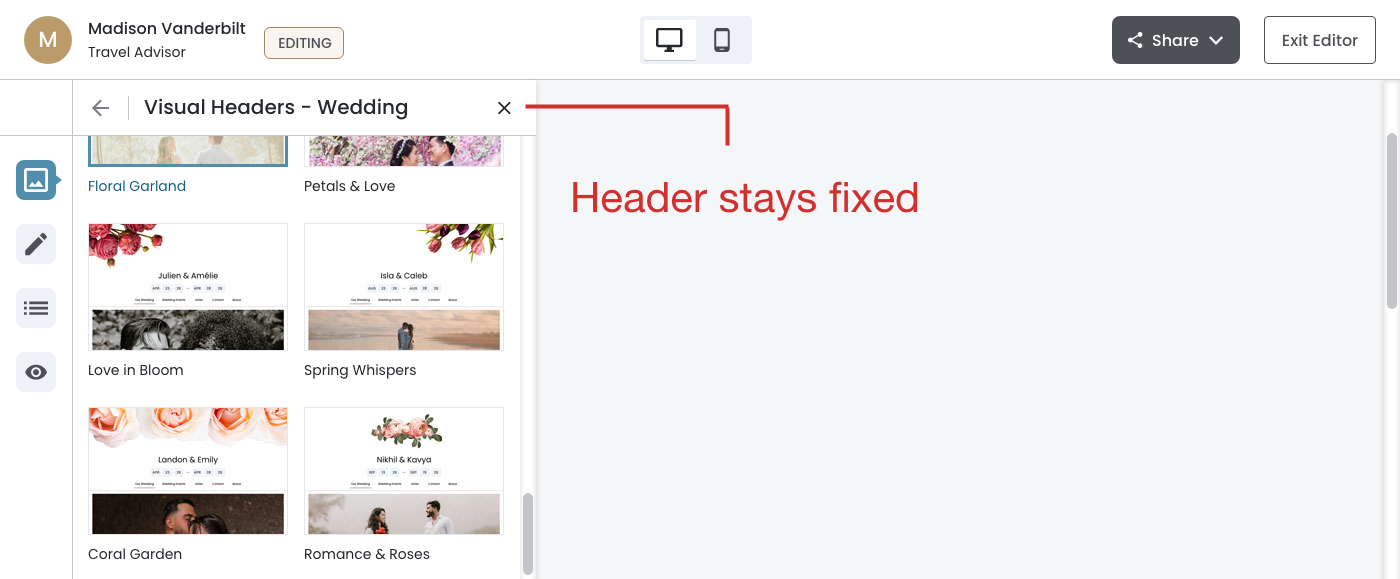 - Fixed header and footer ensure navigation and actions remain accessible during scrolling, critical when browsing up to 15+ visual header options