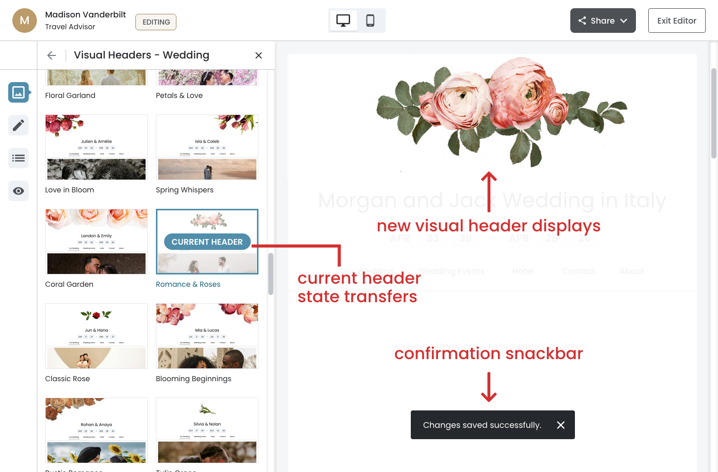 - The 'Current Header' state transfers to Romance & Roses (teal border + badge)