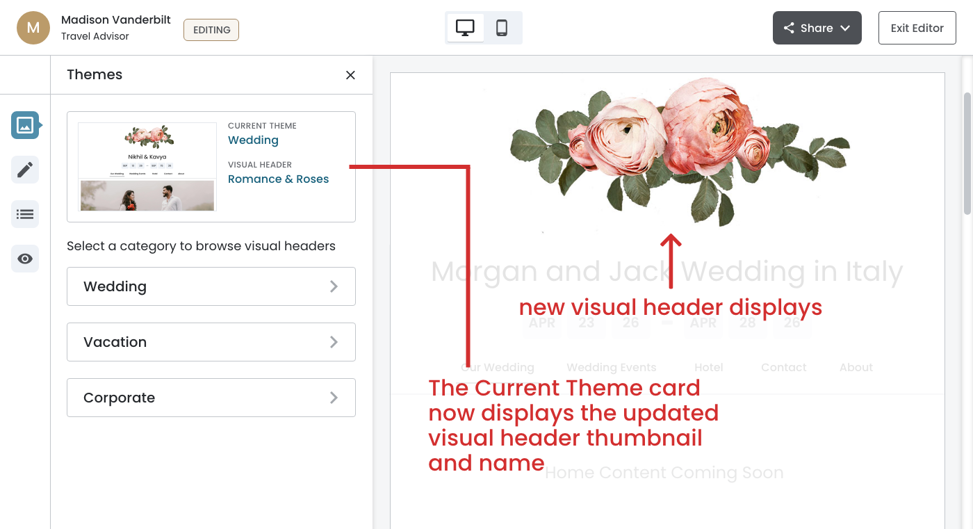 - The Current Theme card now displays the updated visual header thumbnail and name (Romance & Roses)