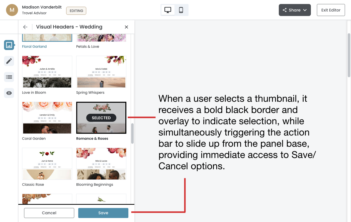 When a user selects a thumbnail, it receives a bold black border and overlay to indicate selection, while simultaneously triggering the action bar to slide up from the panel base, providing immediate access to Save/Cancel options.