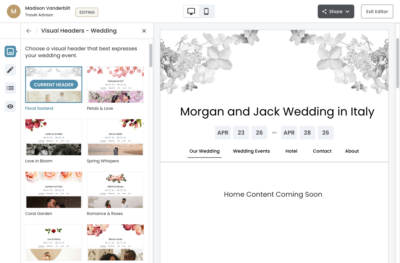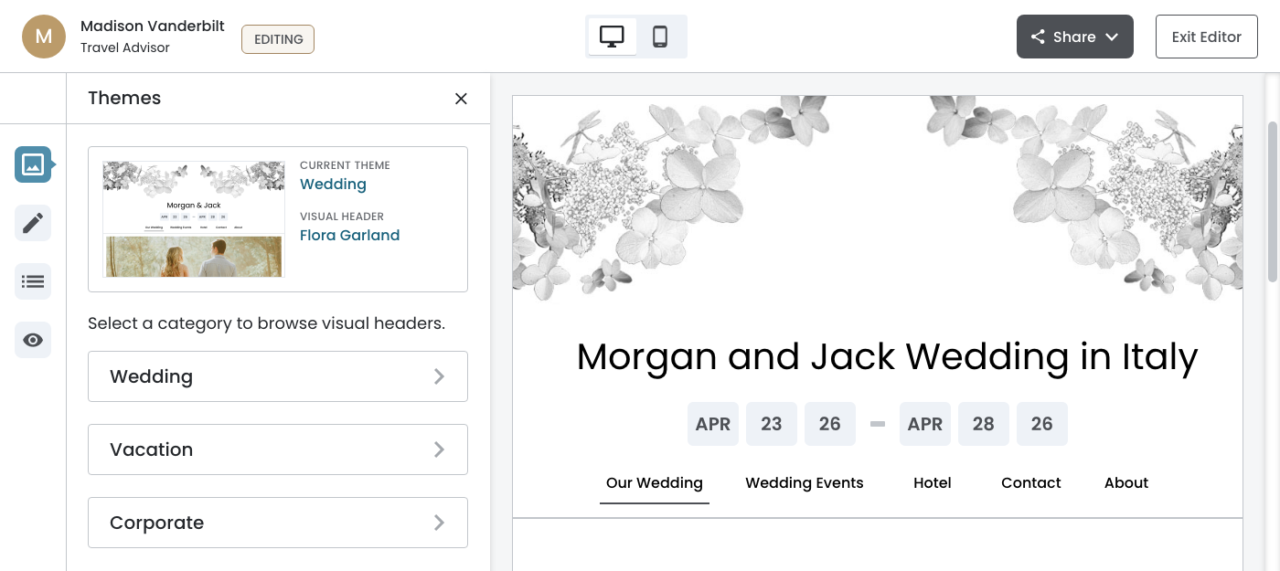 The Theme configuration panel provides travel agents and co‐editors with a streamlined way to customize their event website's visual identity. Given that co‐editors (often the bride or corporate event lead) typically join after the initial theme selection during onboarding, this panel needed to balance discoverability with efficiency.
