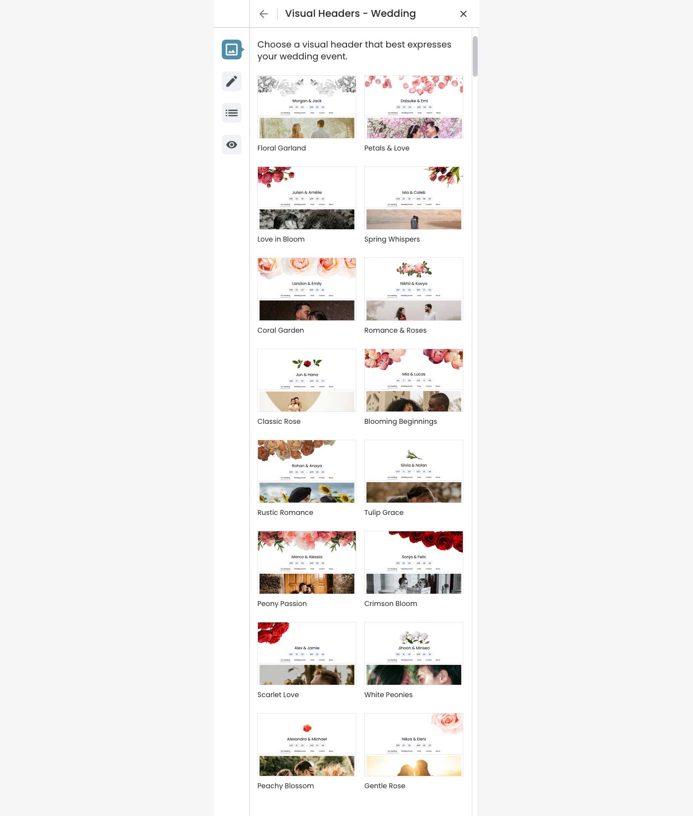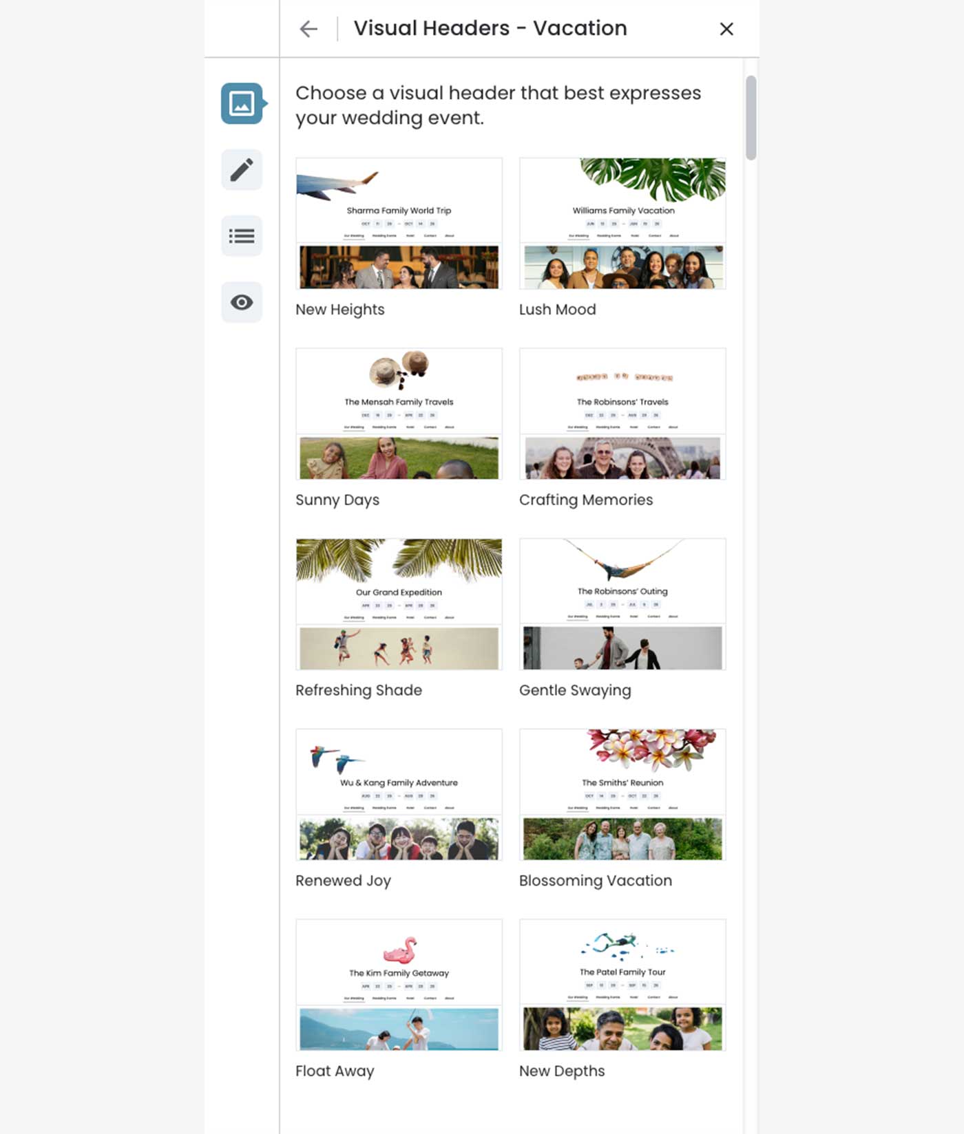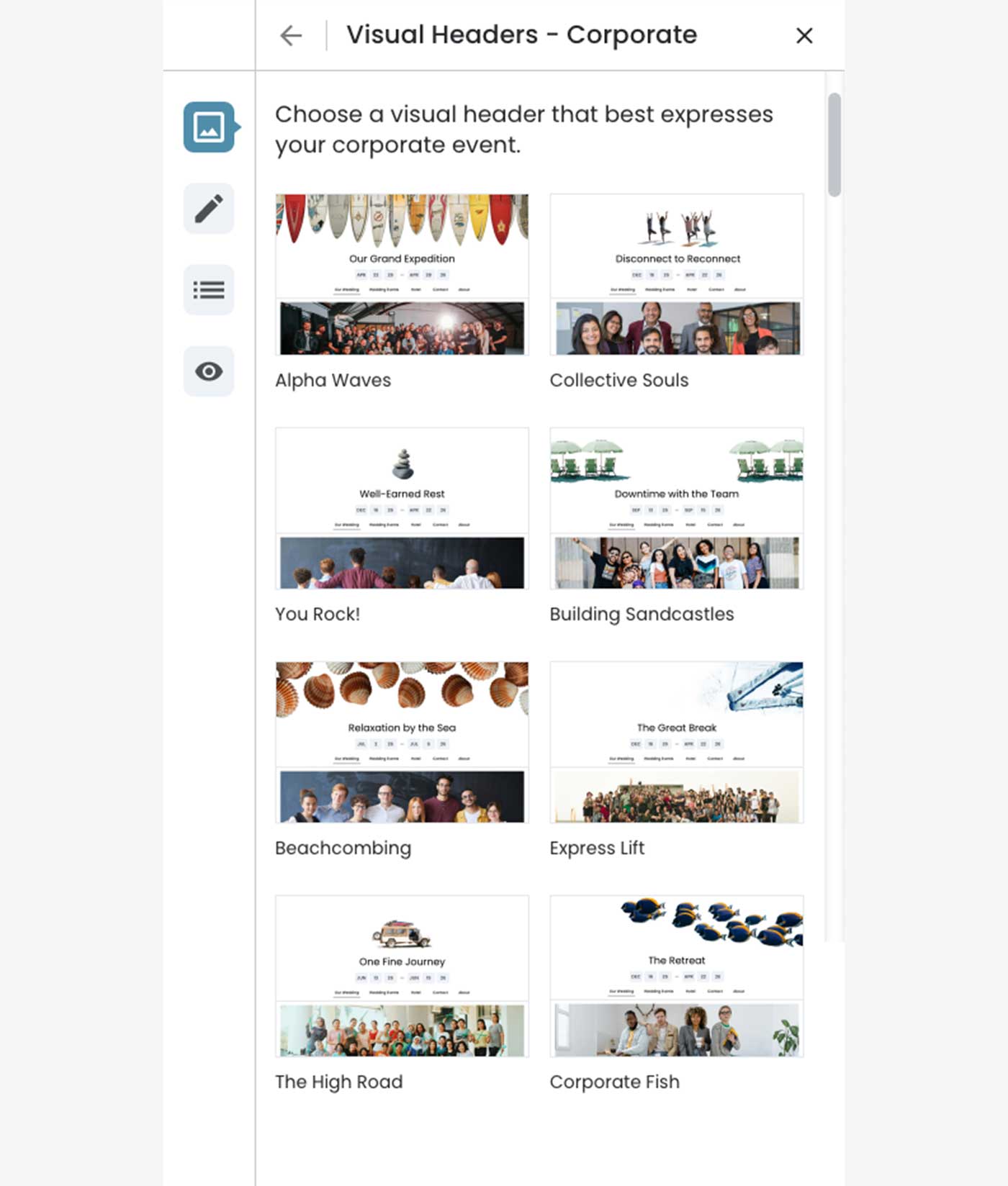 The design employs a two‐level hierarchy: theme categories (Wedding, Vacation, Corporate) serve as the top level, with visual headers‐the decorative designs that express each theme‐nested within. This structure acknowledges that while the theme category aligns with the event type, the specific visual header is what truly personalizes the experience.