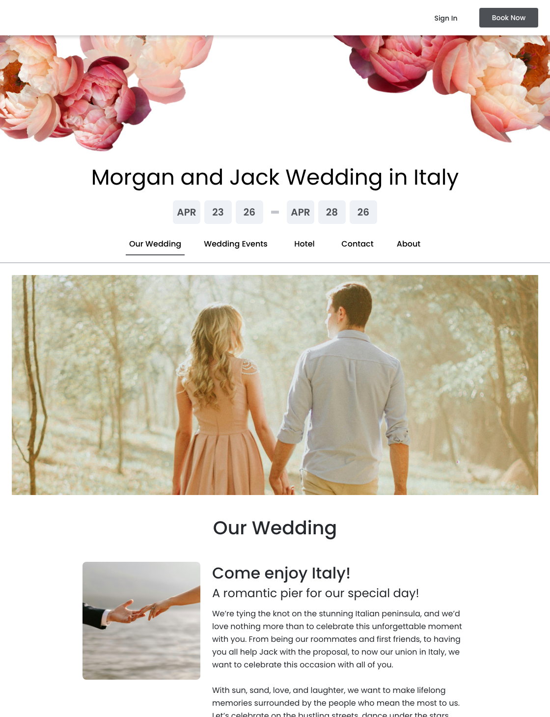 - Event title section ("Morgan and Jack Wedding in Italy")